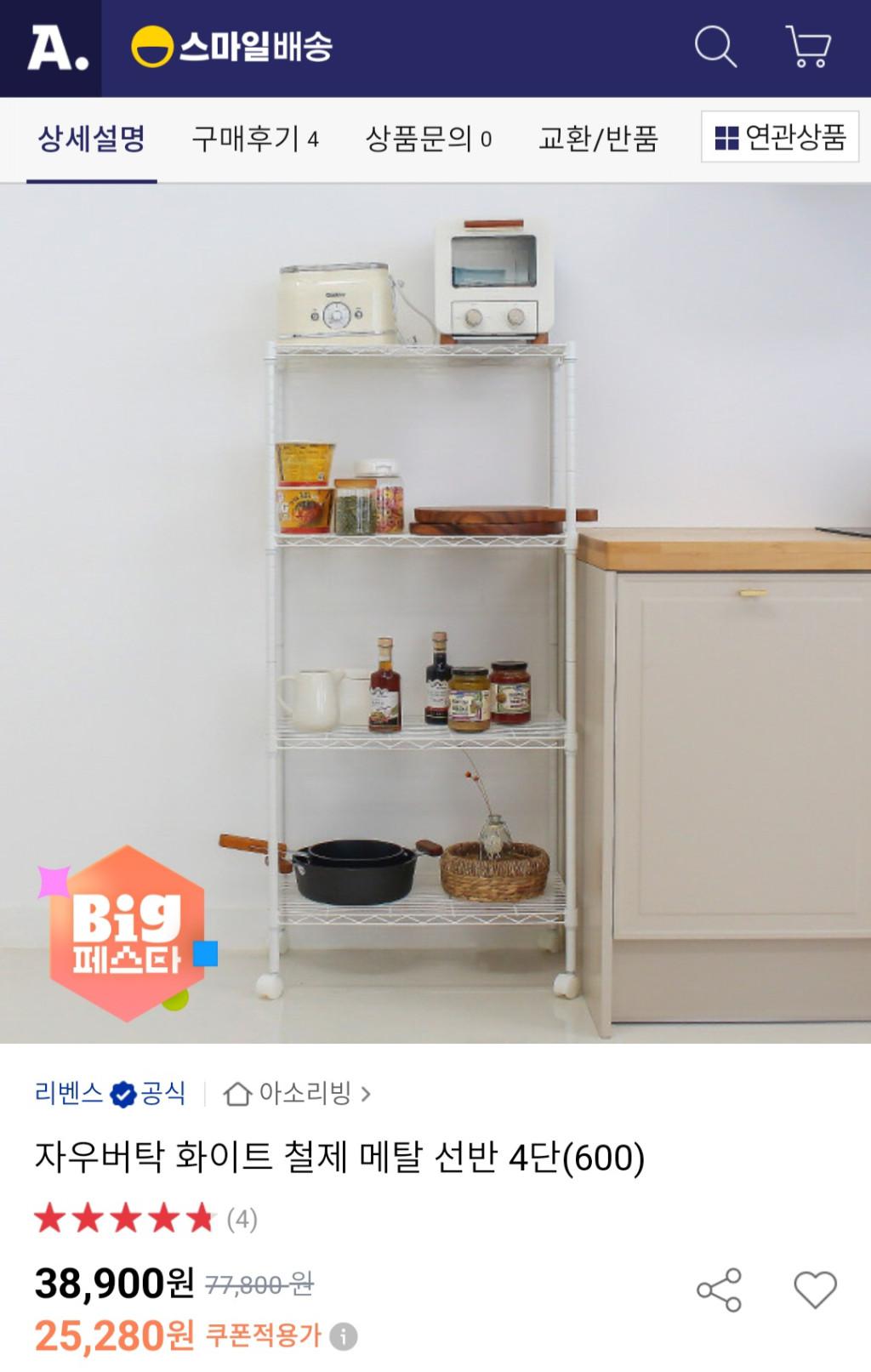 [옥션] 화이트 철제 메탈 선반 4단(600)