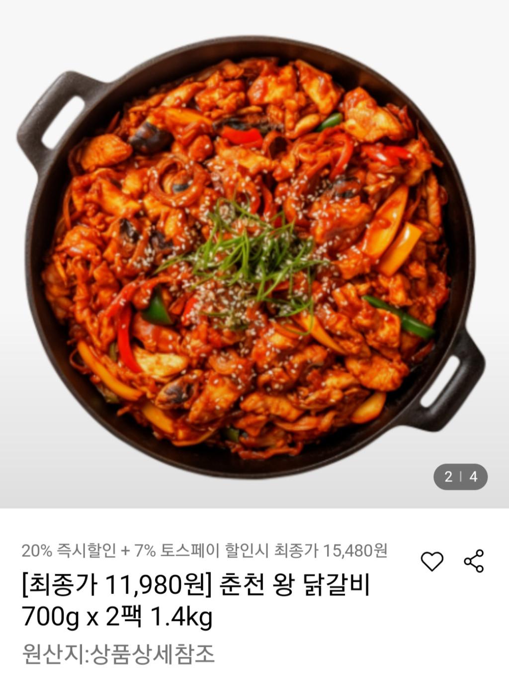 [롯데온] 춘천 왕 닭갈비 700g x 2팩 (11,980원 / 무료배송)