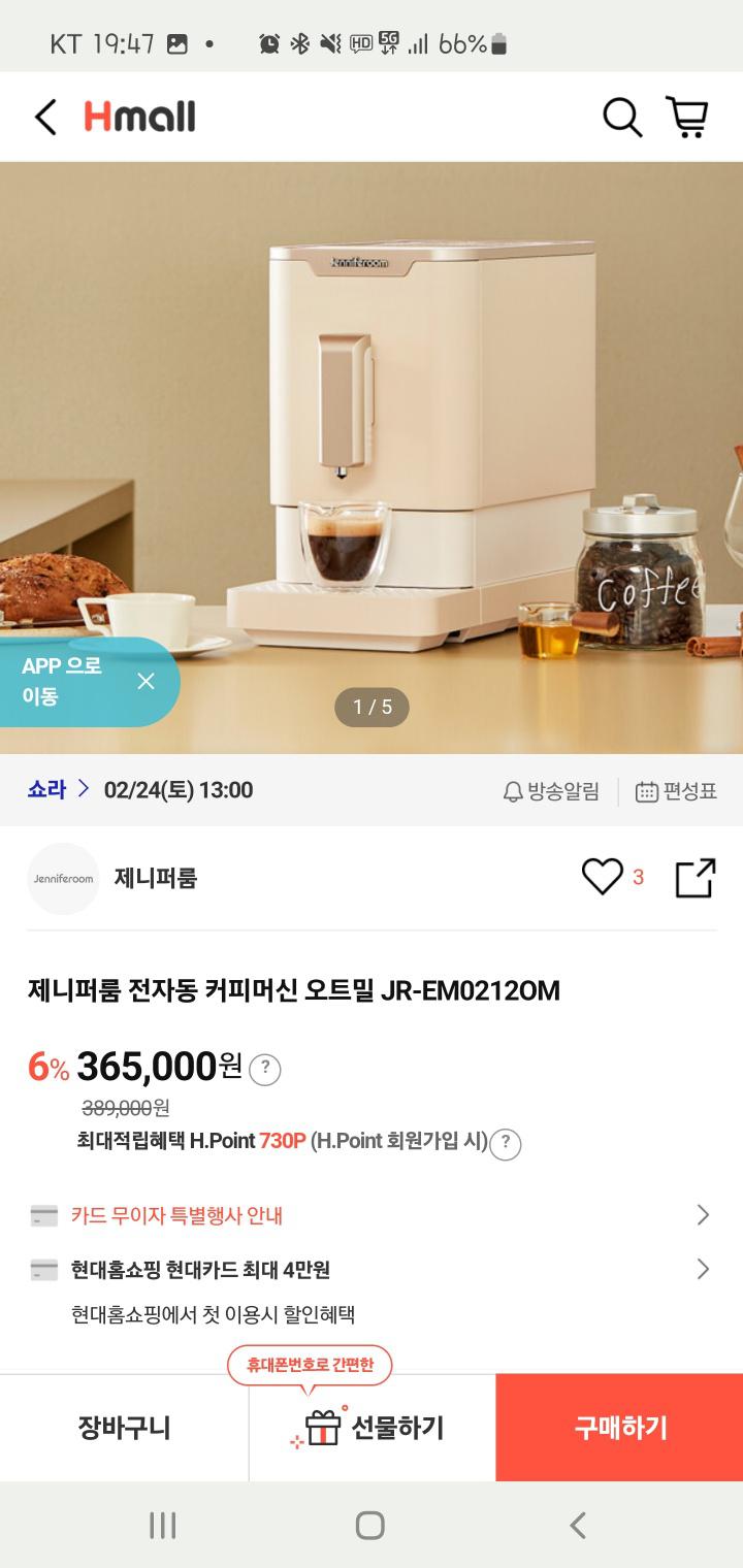 [기타] [H몰] 제니퍼룸 전자동 커피머신 JR-EM0212OM (334,500원)(무료)