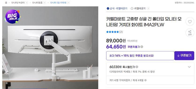 [G마켓] [슈퍼딜] 카멜마운트 IMA2PL 폴타입 고중량 모니터암 (~2/25)