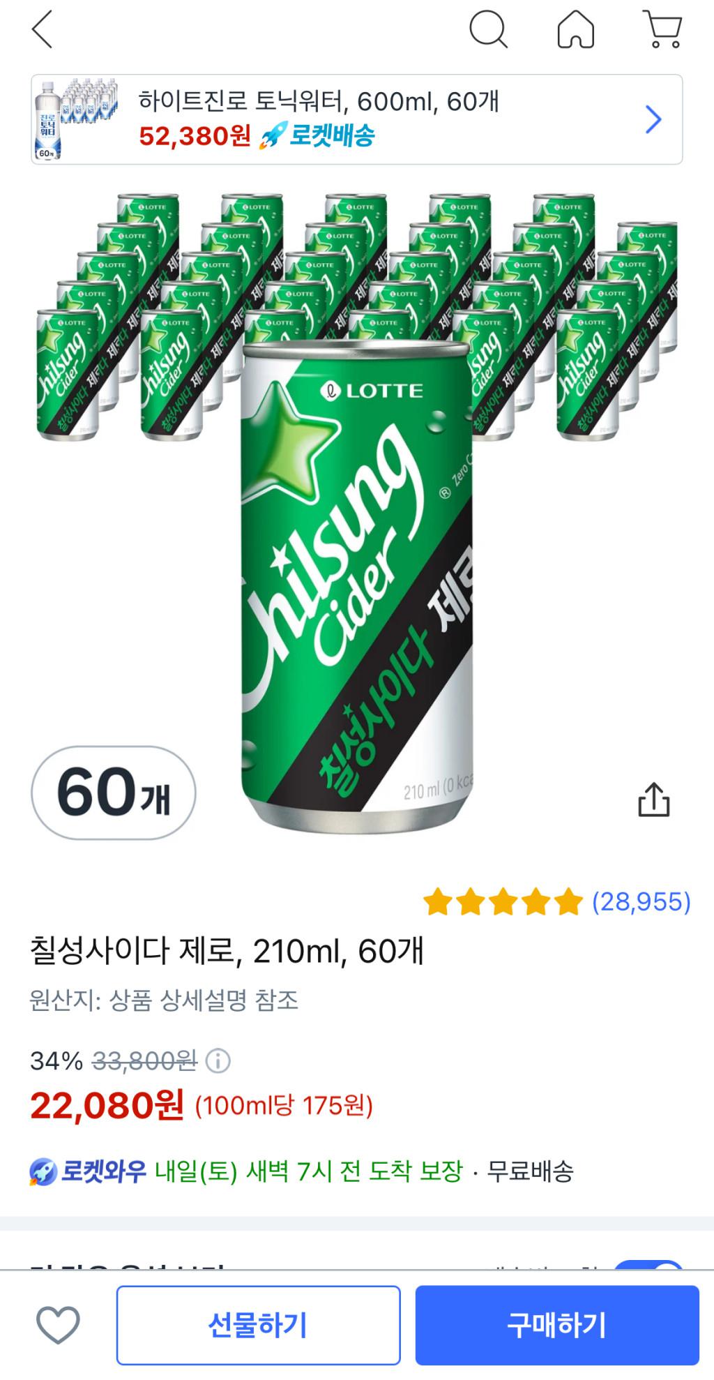 [쿠팡] 칠성사이다 제로 210ml x 60개 (22,080원)(무배)