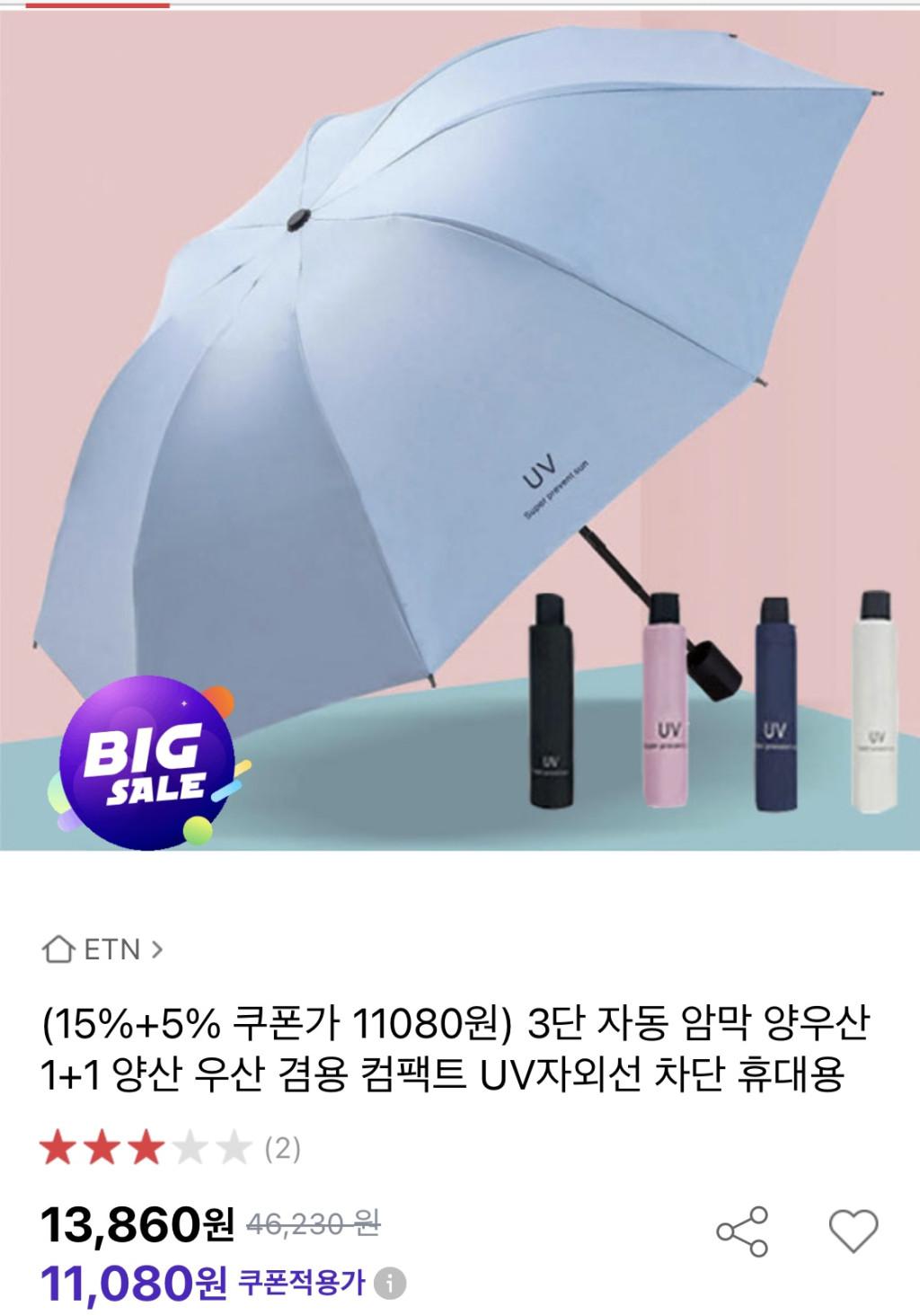 [옥션] 3단 자동 암막 양산 우산 1+1 15%+5% 쿠폰가 11,080원/무배