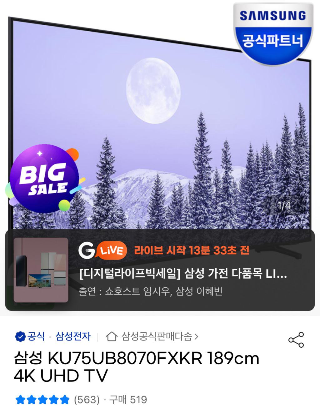 [지마켓] 삼성전자 75인치 UHD TV KU75UB8070FXKR (1,259,000원/무배)