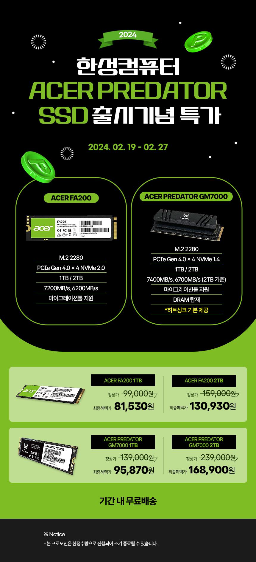 [G마켓] [지마켓] 한성컴퓨터, 에이서 프레데터 GM7000 M.2 NVMe (1TB,2TB) …