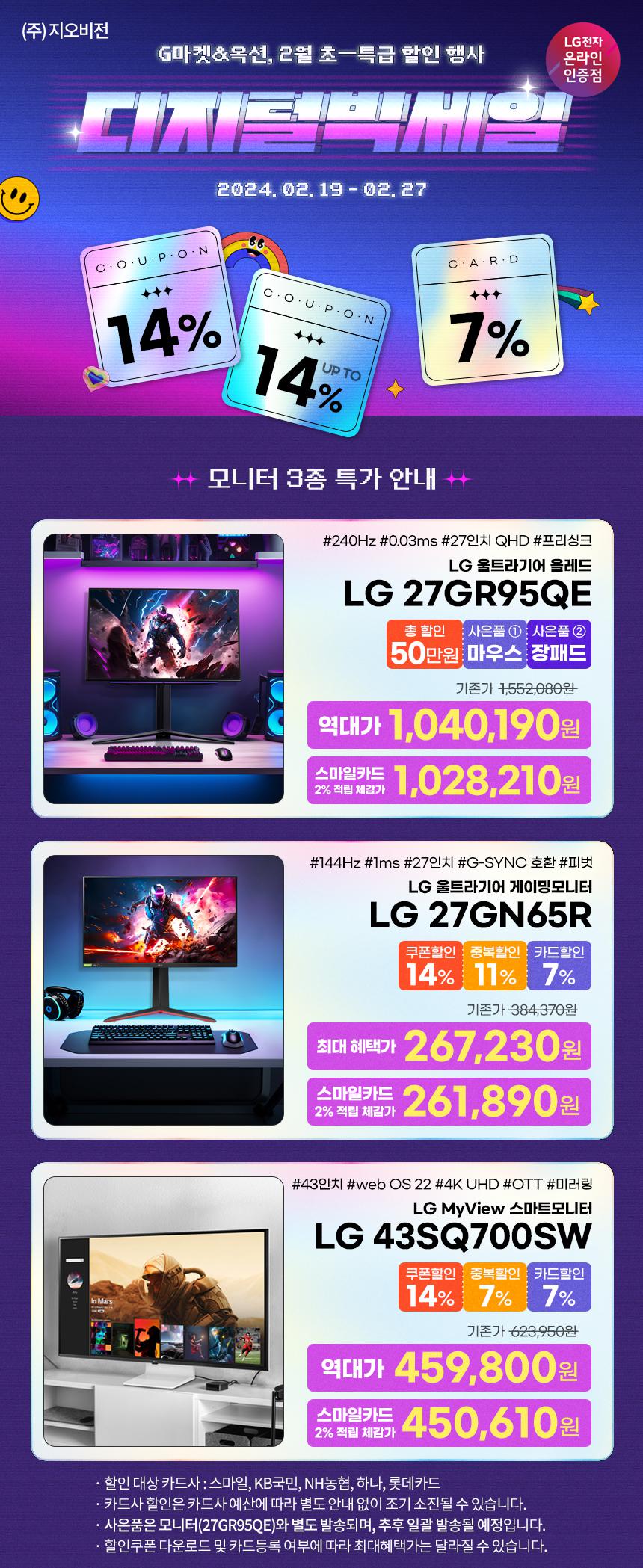 [G마켓] 디지털빅세일 LG 43SQ700SW, 27GR95QE, 27GN65R 역대가 할인 사전…