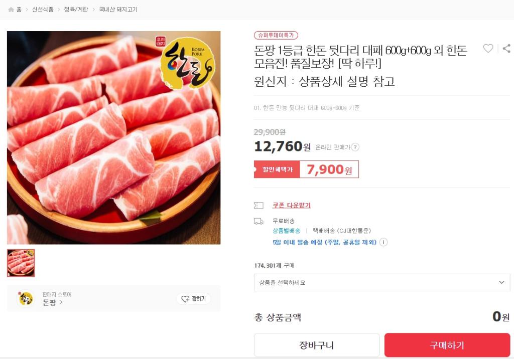 [위메프] 한돈 뒷다리 대패 600g+600g (7,900/무료 배송)