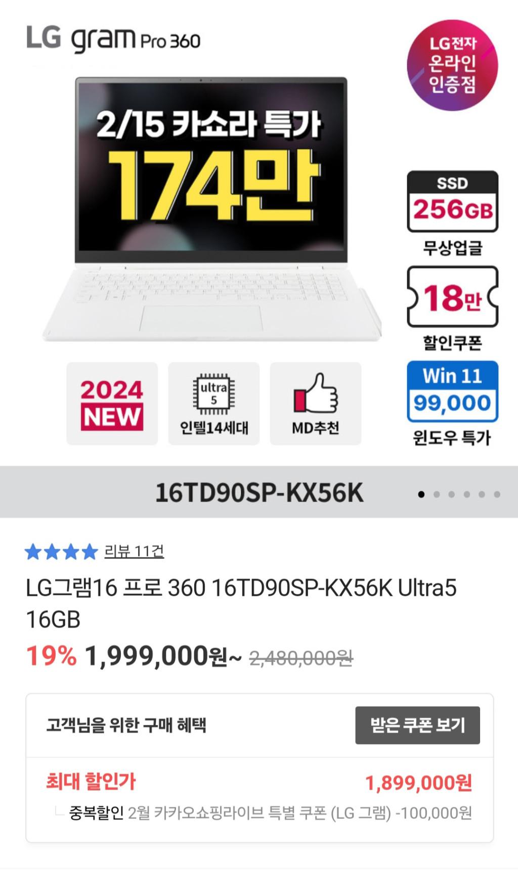 [카카오톡딜] LG그램16 프로360 16TD90SP-KX56K Ultra5 16GB