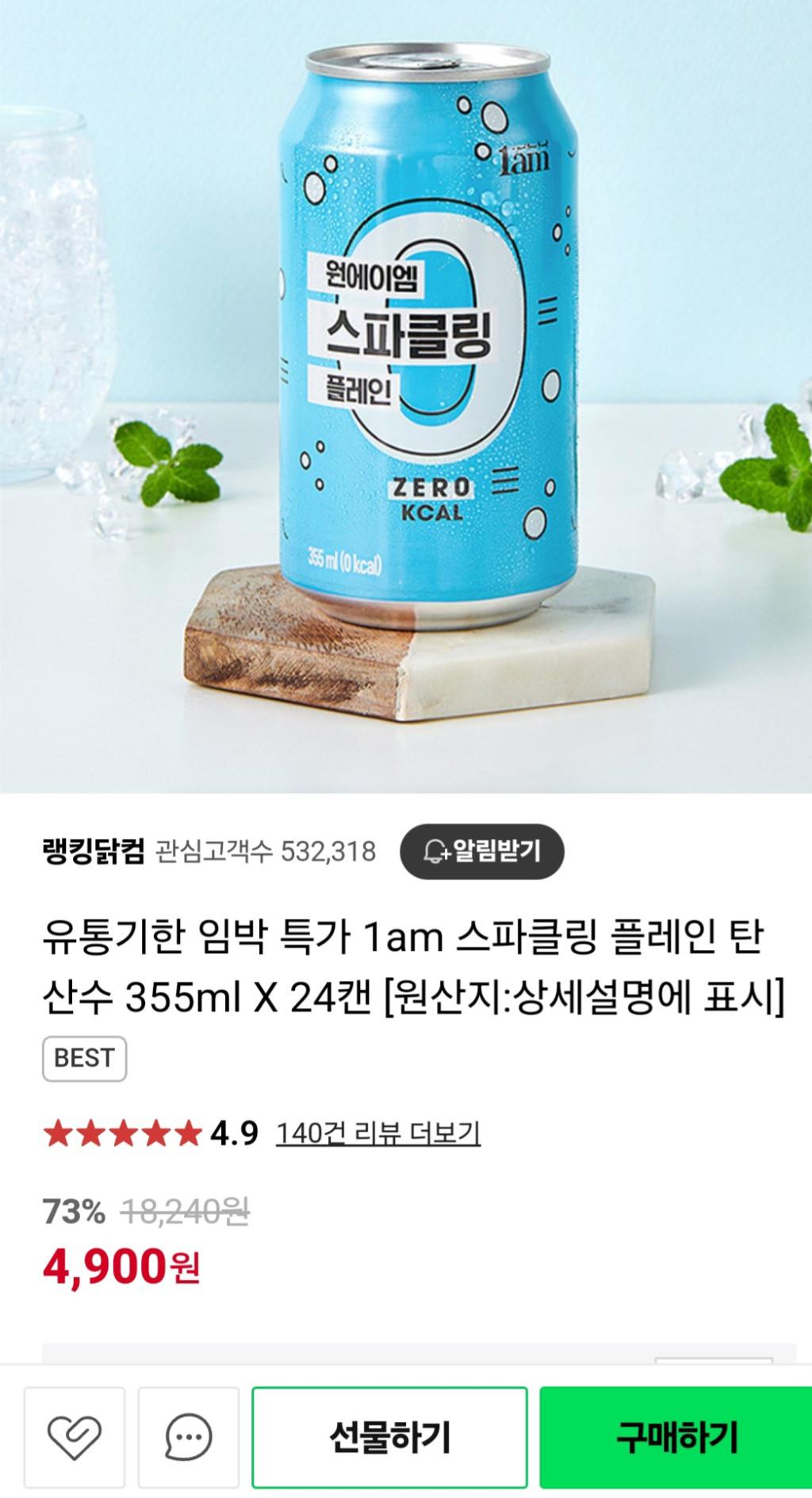 [네이버] 1am 스파클링 플레인 탄산수 355ml X 24캔 유통기한임박 (무배)