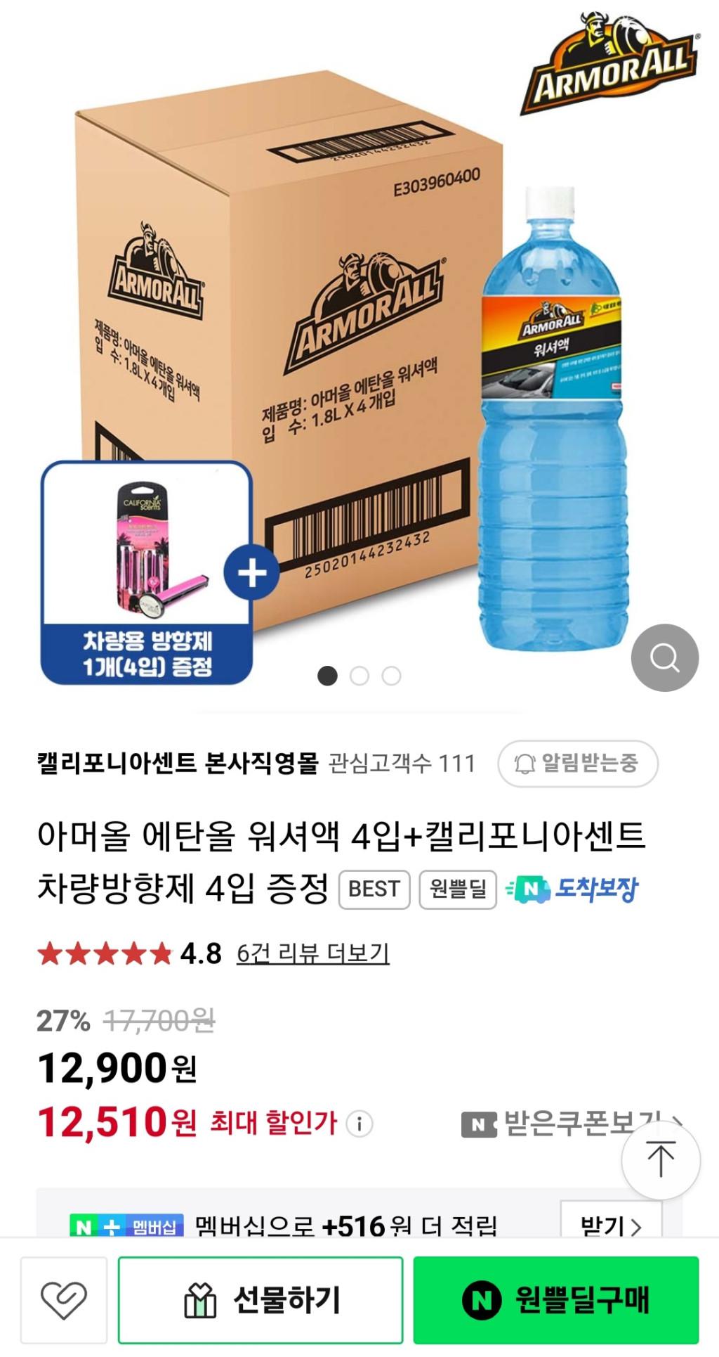 [네이버] 아머올 에탄올 워셔액 1.8L 4입+차량방향제 4입 증정(무배)