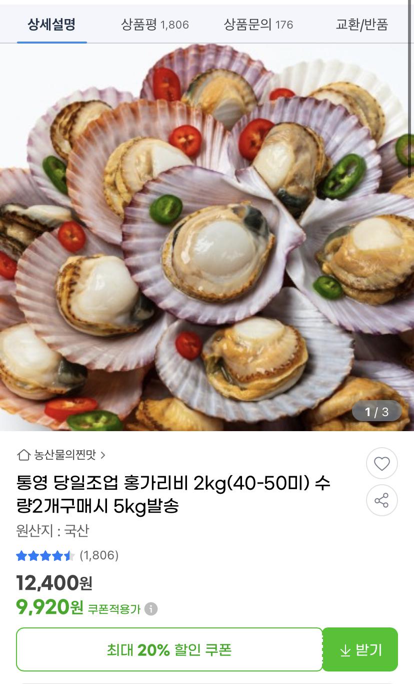 [G마켓] 통영 당일조업 홍가리비 2kg(40-50미) 수량2개구매시 5kg발송