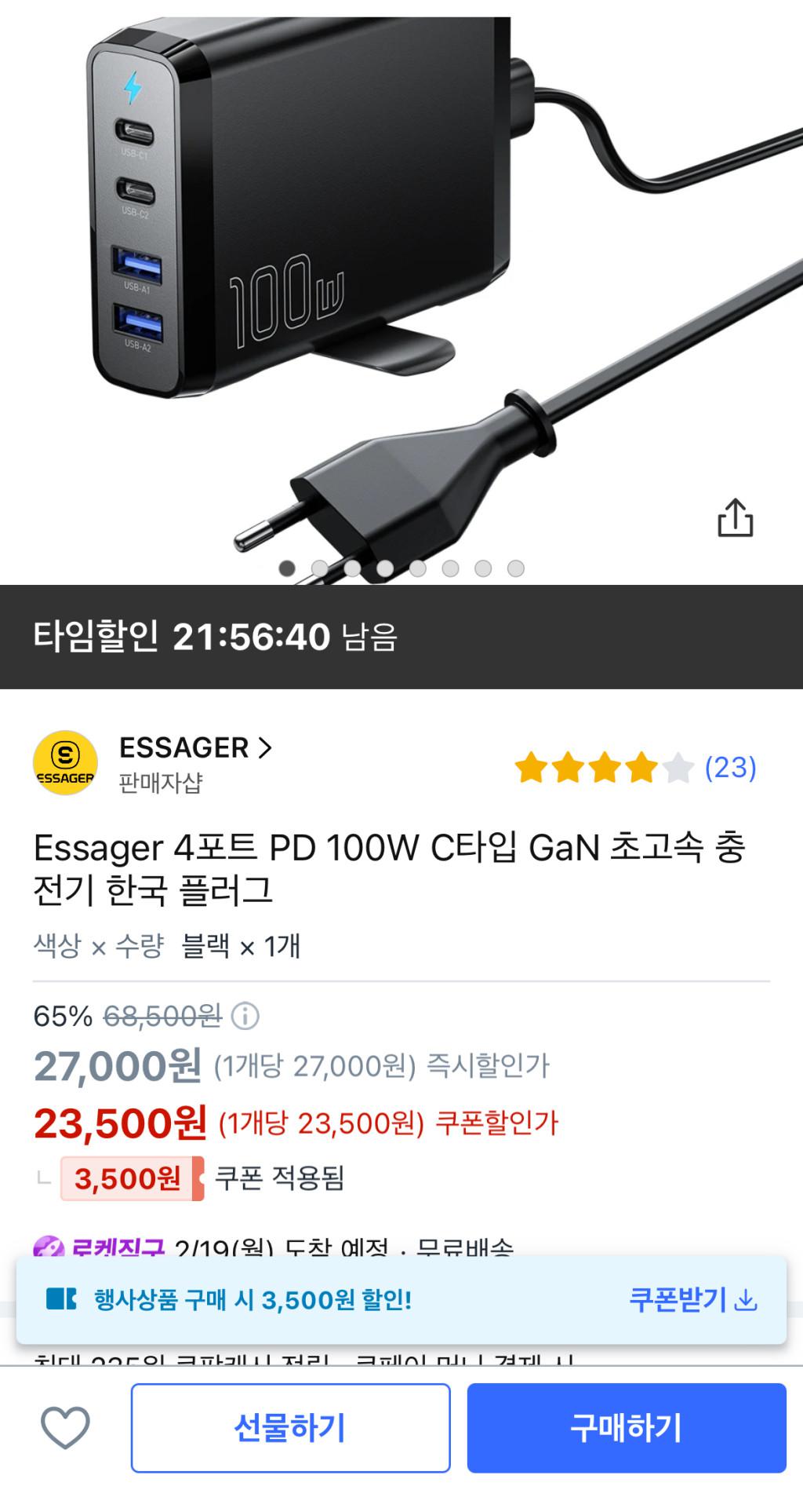 [쿠팡] Essager 4포트 PD 100W C타입 GaN 초고속 충전기 한국 플러그 (2350…
