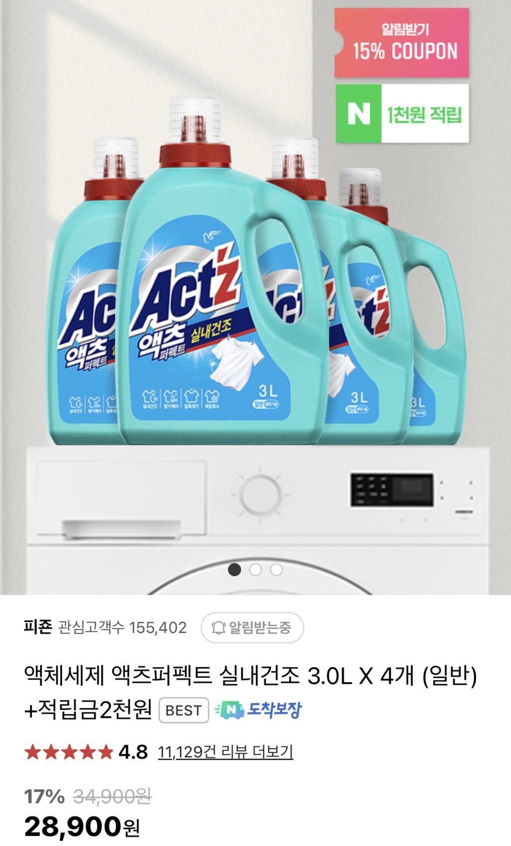 [네이버] 액체세제 액츠퍼펙트 실내건조 3L 4개 (24,560원/무료)
