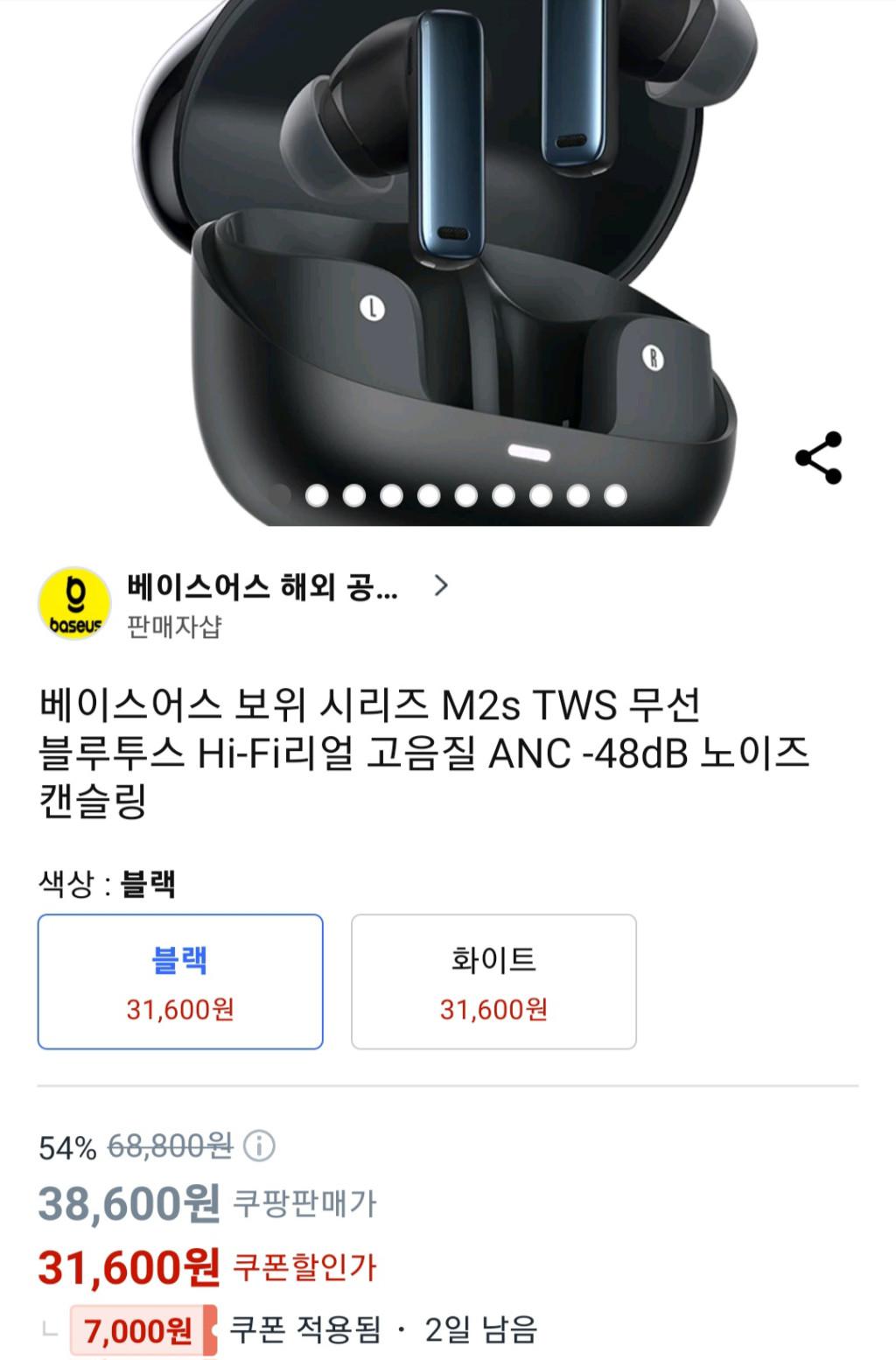 [쿠팡] 베이스어스 보위 시리즈 M2s TWS 무선 블루투스 Hi-Fi리얼 고음질 ANC -48…