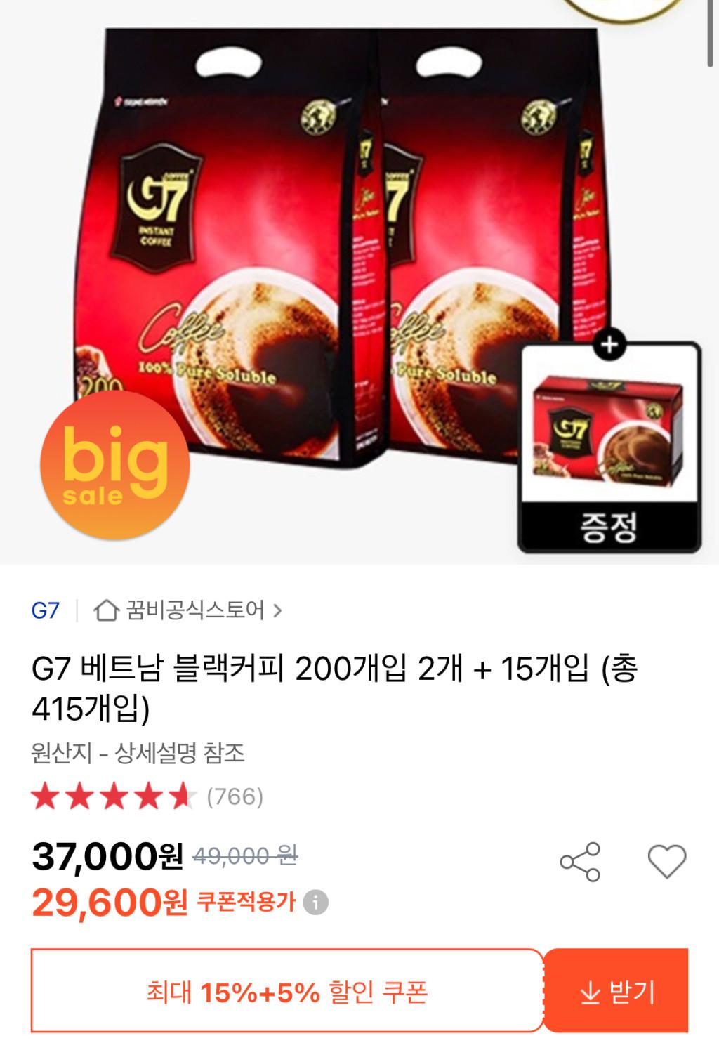 [옥션] g7 퓨어블랙 커피 200개입 x 2개 + 15개입 (총 415개입)