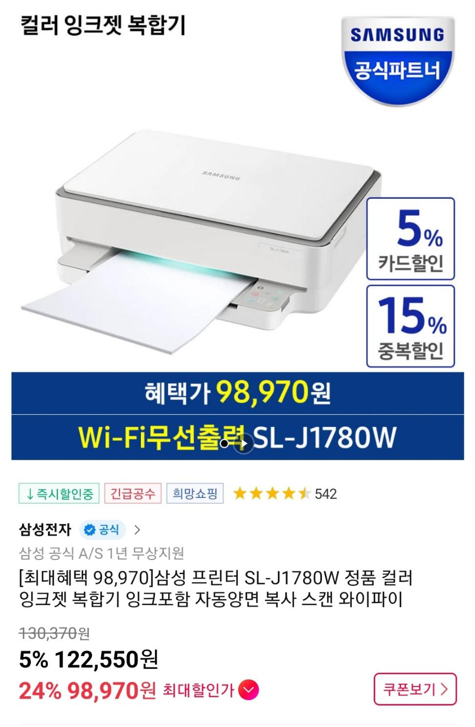 [11번가] 삼성 프린터 SL-J1780W 잉크젯 복합기 자동양면 복사 스캔 wifi 카할