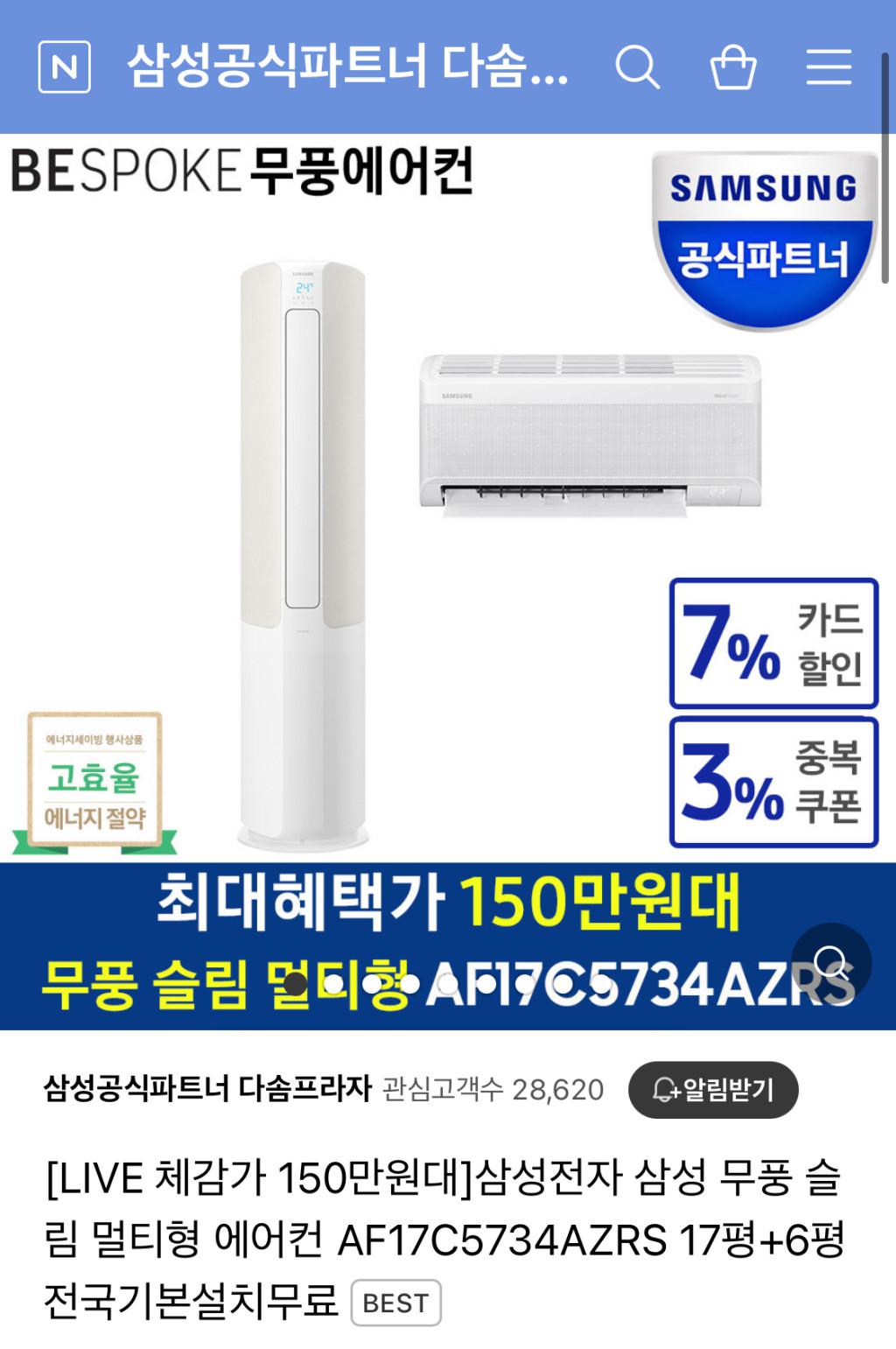 [네이버] 삼성 17평 무풍슬림 멀티형 에어컨 AF17C5734AZRS 체감가