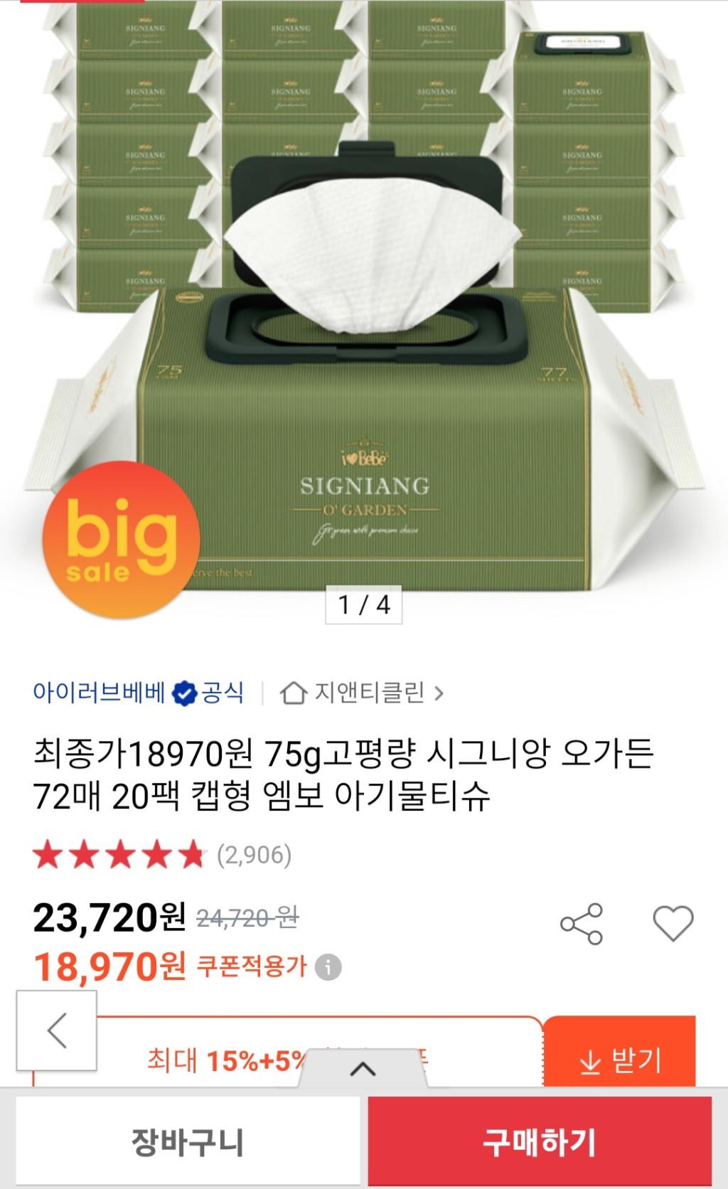 [옥션] 시그니앙 오가든 75g 72매 20팩 물티슈 캡형(무배)