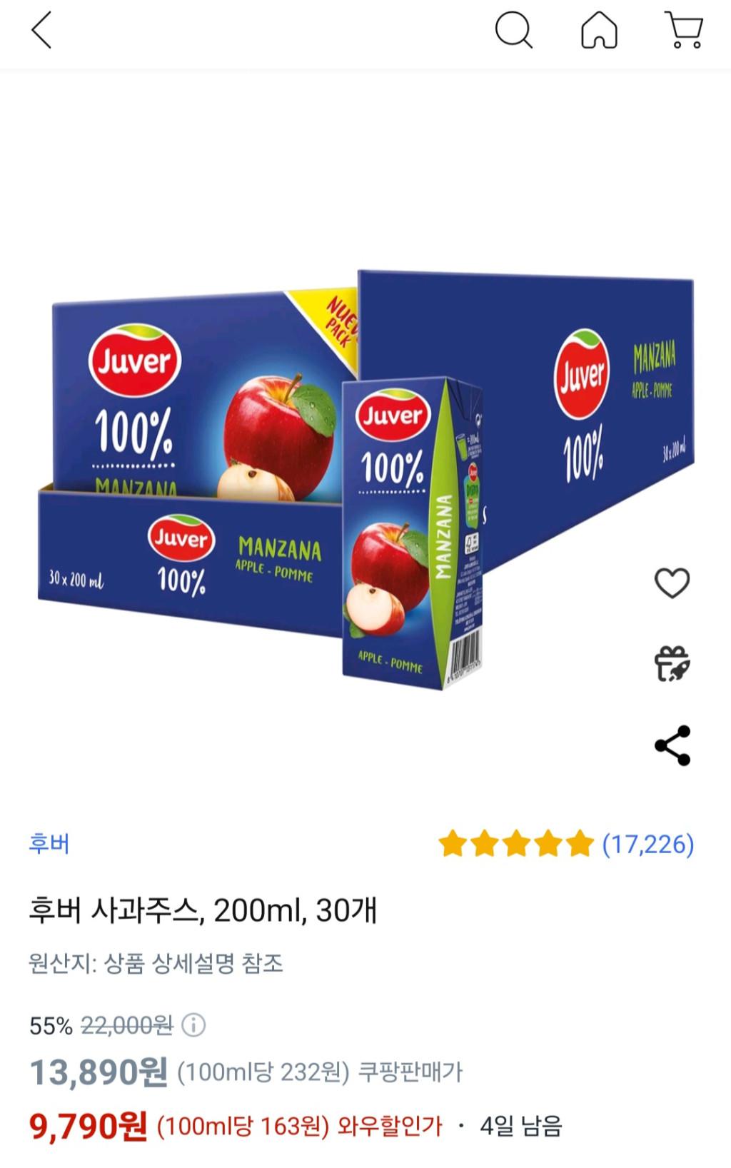 [쿠팡] 후버 사과주스, 200ml, 30개
