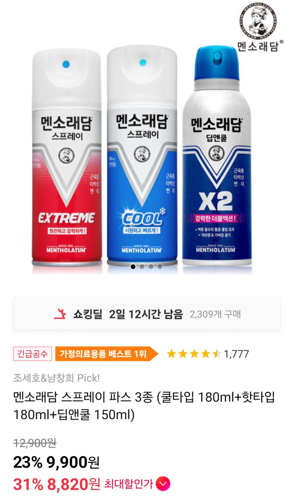 [11번가] 멘소래담 스프레이 파스 3종(쿨+핫+딥앤쿨) 등 다양 티멤버십(무배)