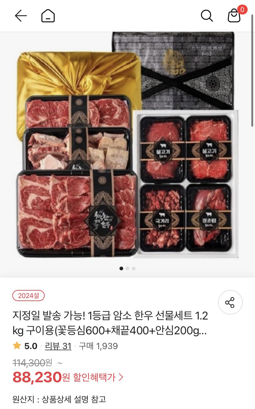 [위메프] 1등급한우 선물세트 구이용 1.2Kg