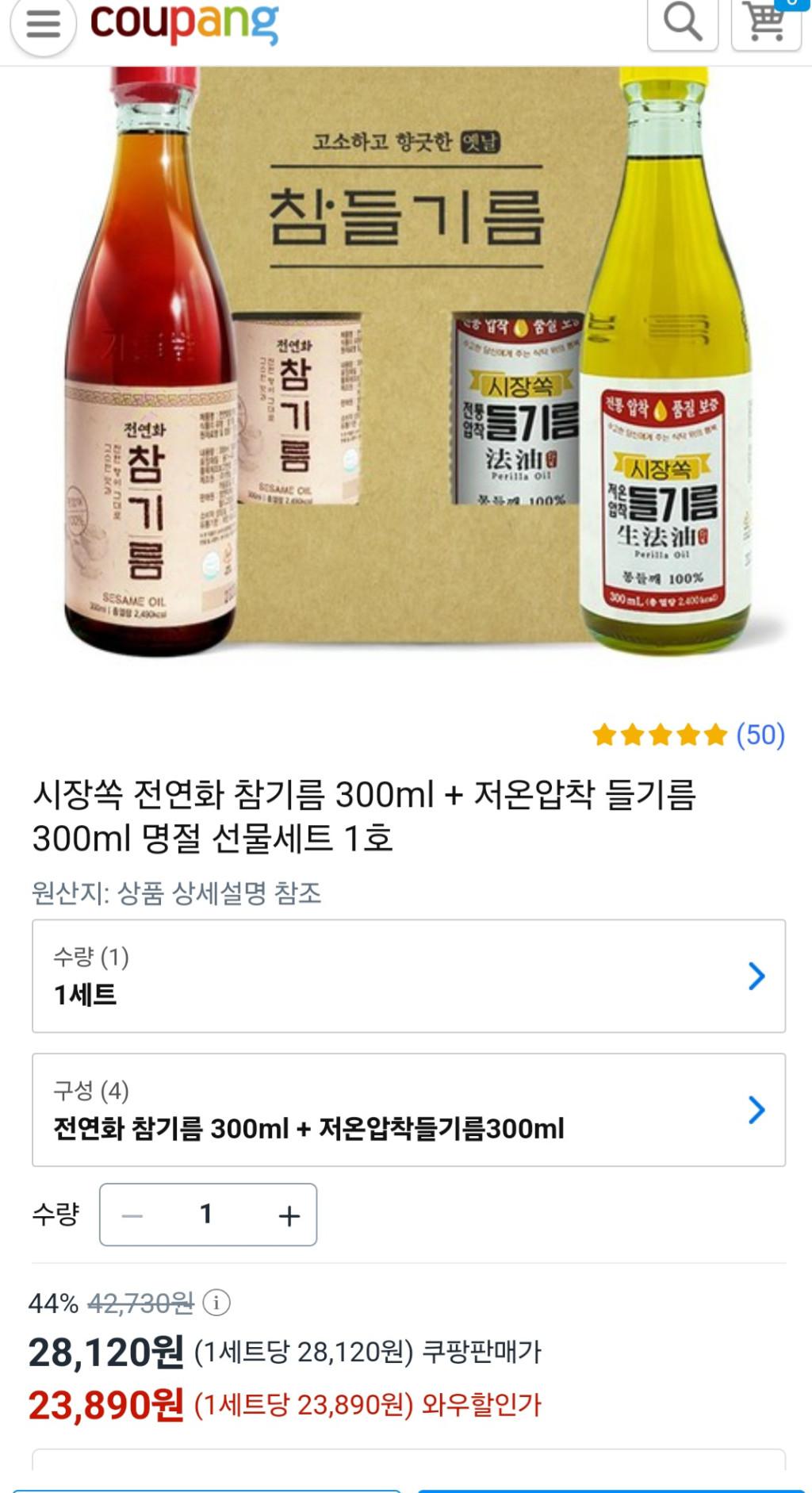[쿠팡] 전연화 참기름+들기름 각300ml 선물세트