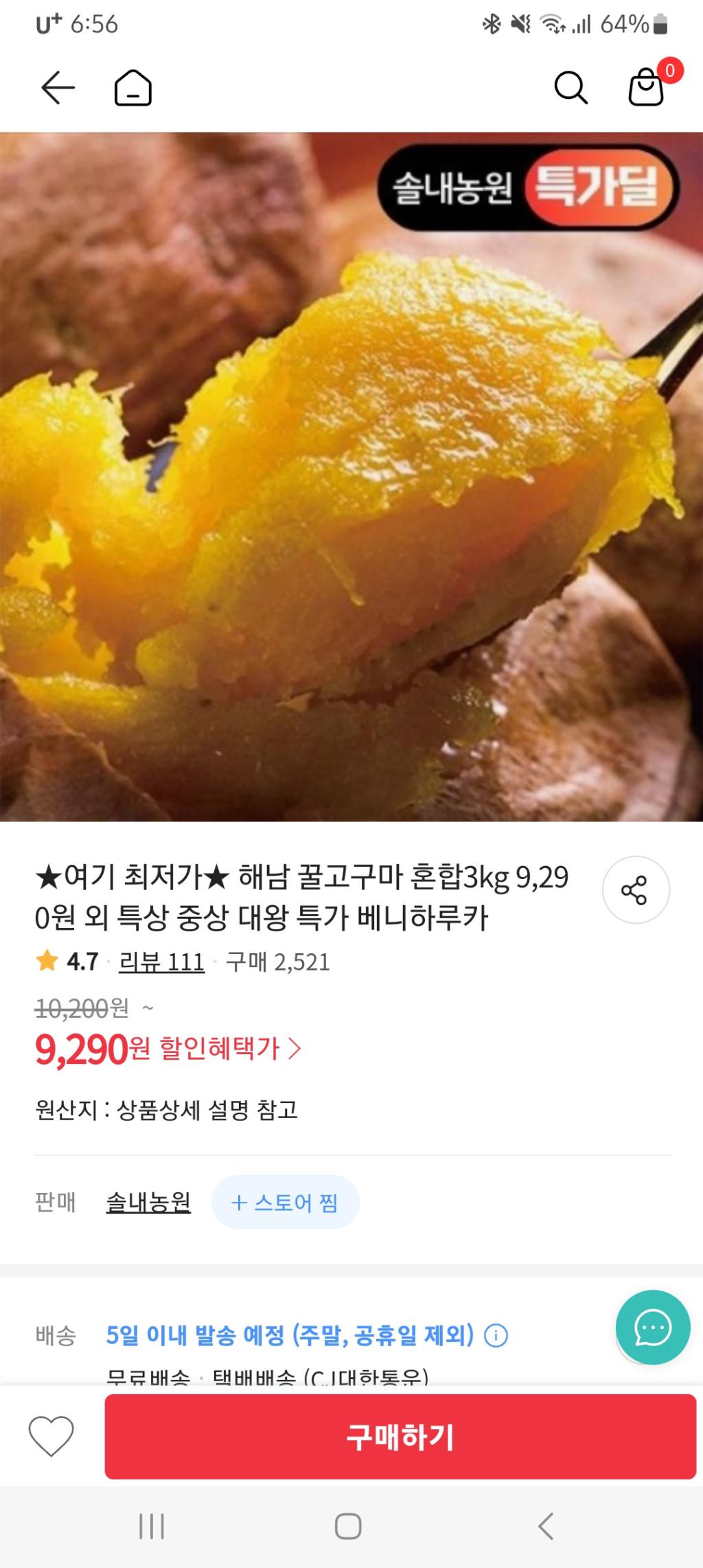 [위메프] 무농약 해남 꿀고구마 특상+중상 혼합3kg