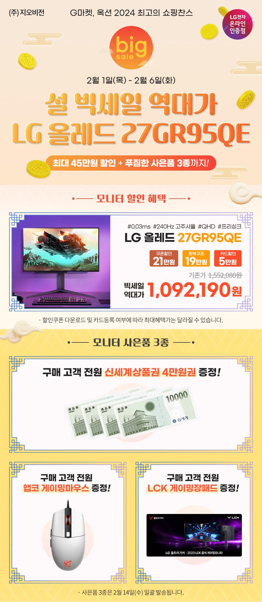 [지마켓/옥션] LG 올레드 27GR95QE 설빅세일 역대가 추가행사 안내(혜택가:105만)
