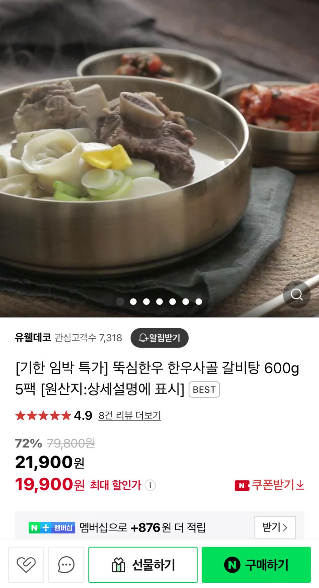[네이버] 뚝심한우 한우사골 갈비탕 600g 5팩 (19,900원/무배)