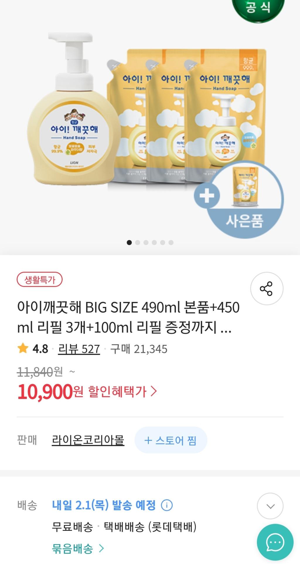 [위메프] 아이깨끗해 핸드워시 490ml 본품용기1개+450ml 리필3개