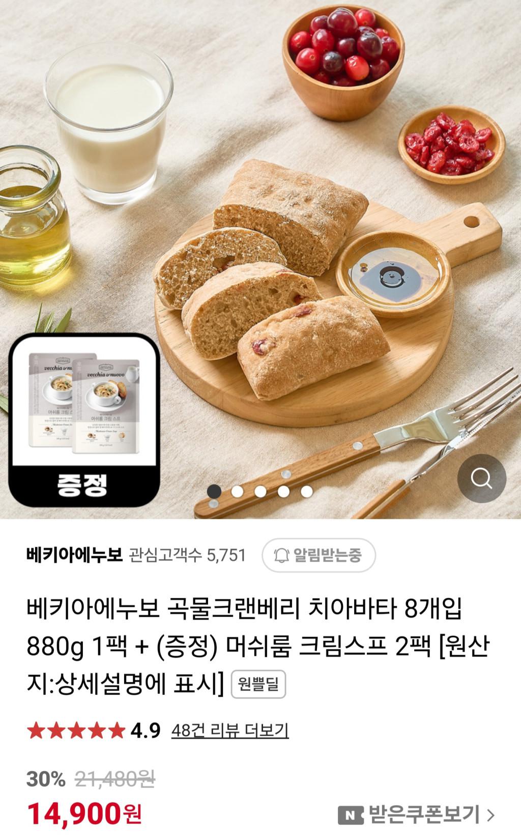 [네이버] 베키아에누보 곡물크랜베리 치아바타 8개입 880g 1팩 + (증정) 머쉬룸 크림스프 2…