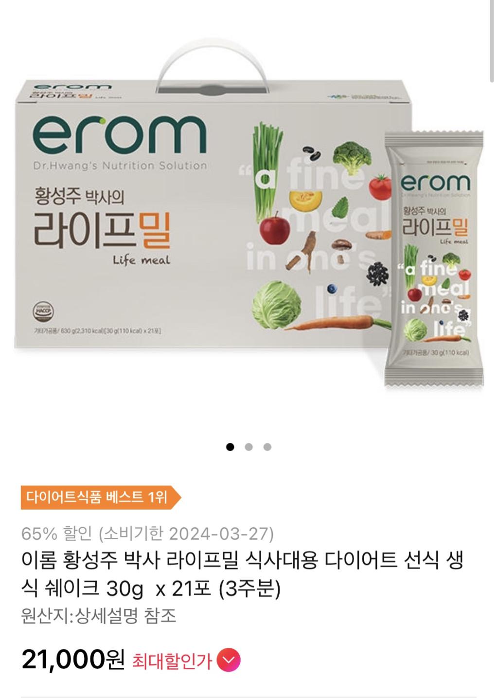 [11번가] 소비기한 임박 이롬 황성주 박사 라이프밀 식사대용 30g x 21포