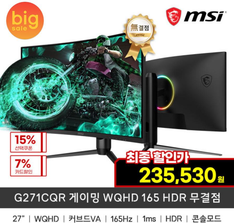 [G마켓] 27인치 WQHD 165Hz MSI 게이밍 모니터 (체감가 225,530원)