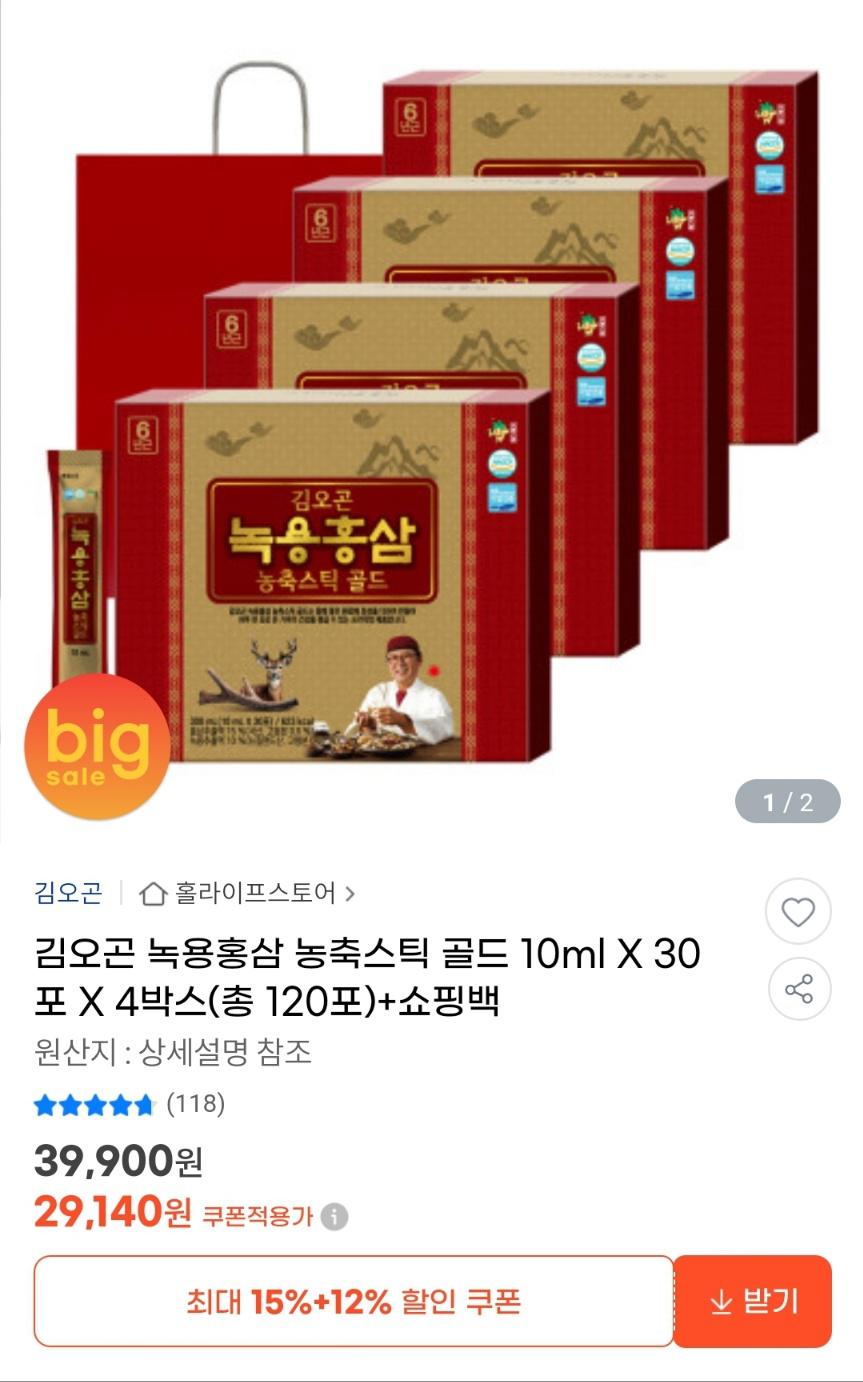 [G마켓] 녹용홍삼스틱 10ml 총120포+쇼핑백