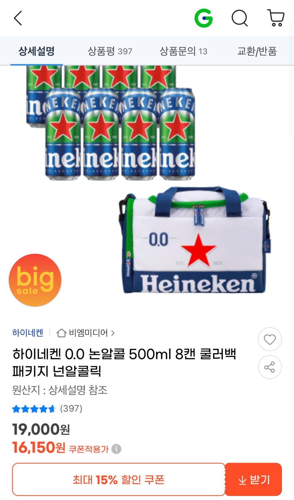 [G마켓] 하이네켄 0.0 논알콜 500ml 8캔 쿨러백패키지 넌알콜릭 + 무료배송