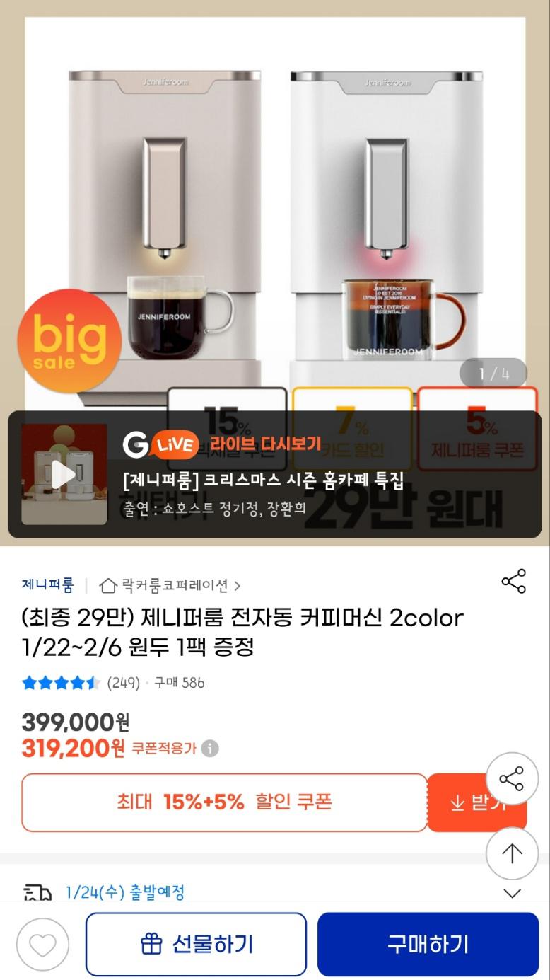 [G마켓] [G마켓] 제니퍼룸 전자동 커피머신 (399,000원 / 무료)