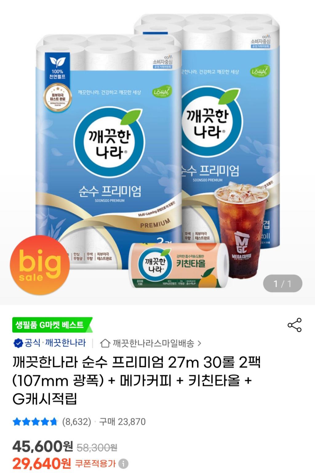 [G마켓] 깨끗한나라 순수 프리미엄 27m 30롤 2팩 + 메가커피 기프티콘 + 키친타올 70매 …