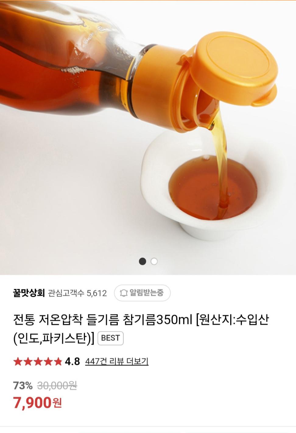 [네이버] 네이버)저온압착으로 만든 참기름 350ml 7900원 무료