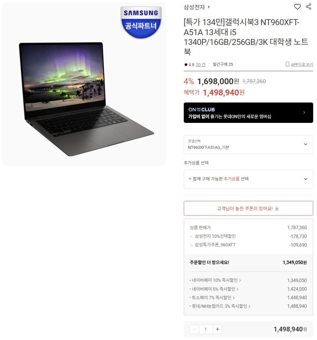 [롯데온] [롯데온] 삼성 갤럭시북 3 프로 NT960XFT-A51A 16인치(1,349,050/…