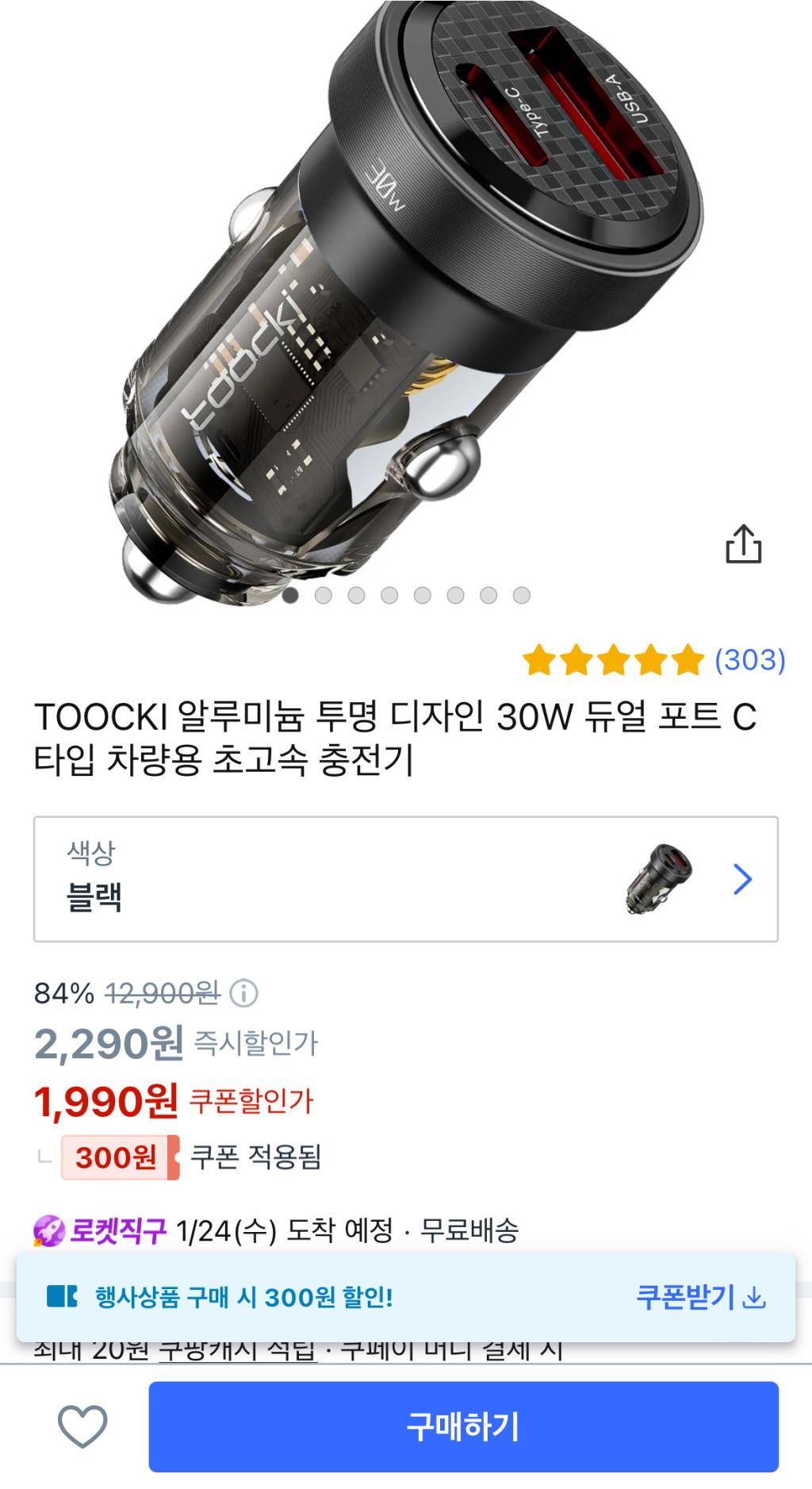 [쿠팡] Toocki 투키 차량용 고속충전기 30W 2포트 (무배)