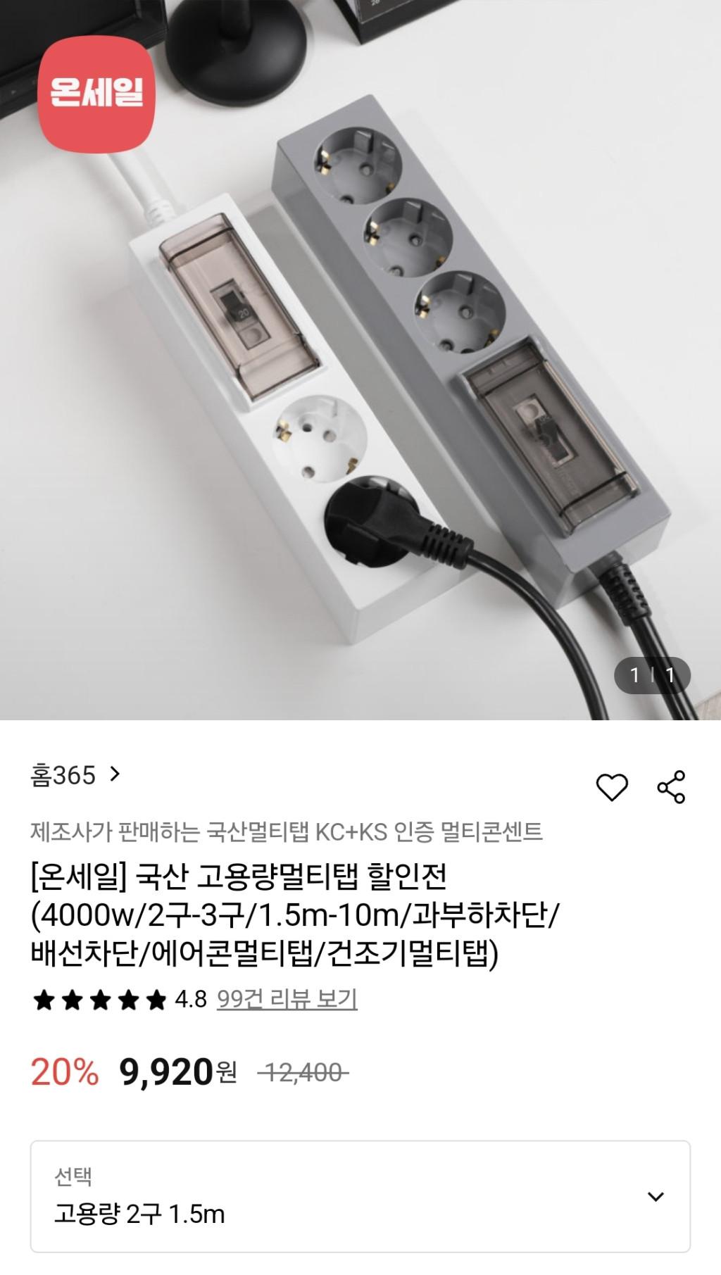 [롯데온] 국산 고용량 멀티탭 2구 1.5m