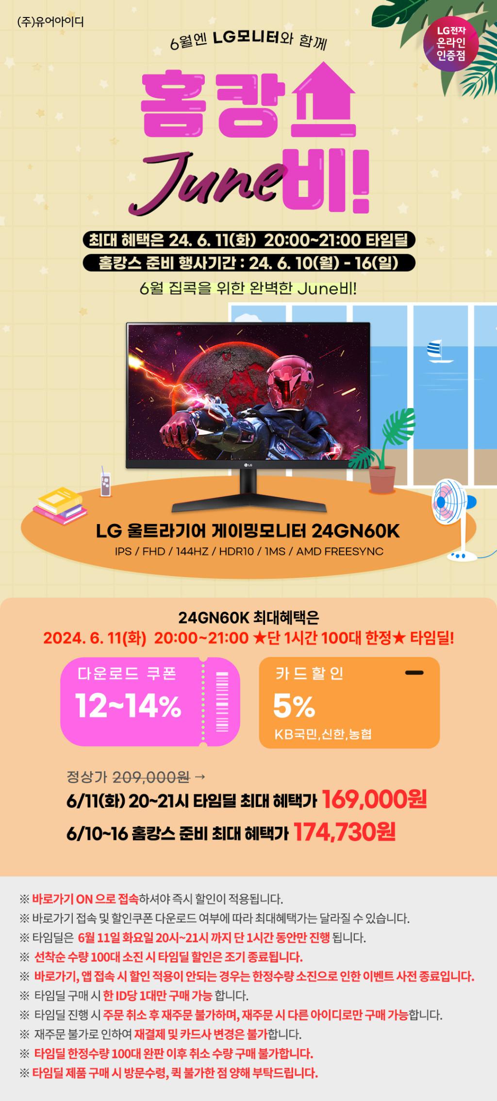 [11번가] LG 24GN60K 24인치 가성비 울트라기어 게이밍모니터 홈캉스 June비 행사 안내…
