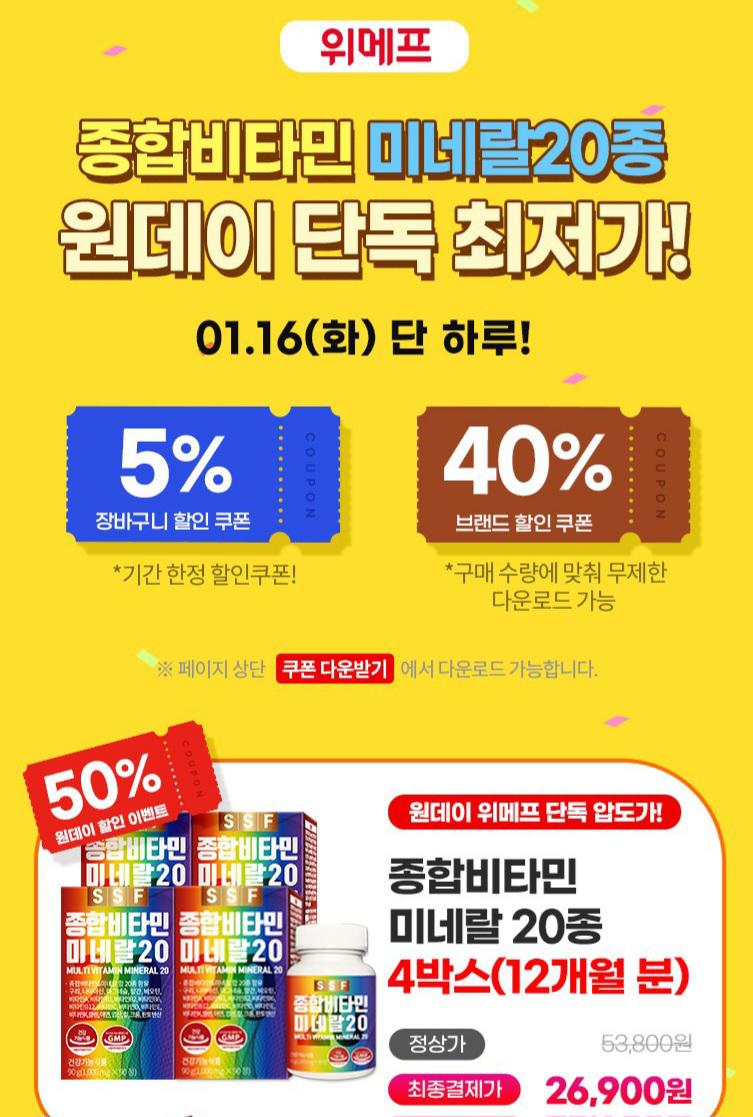 [위메프] 종합비타민 미네랄 20종 x 4박스 (26,900원 / 무료배송)