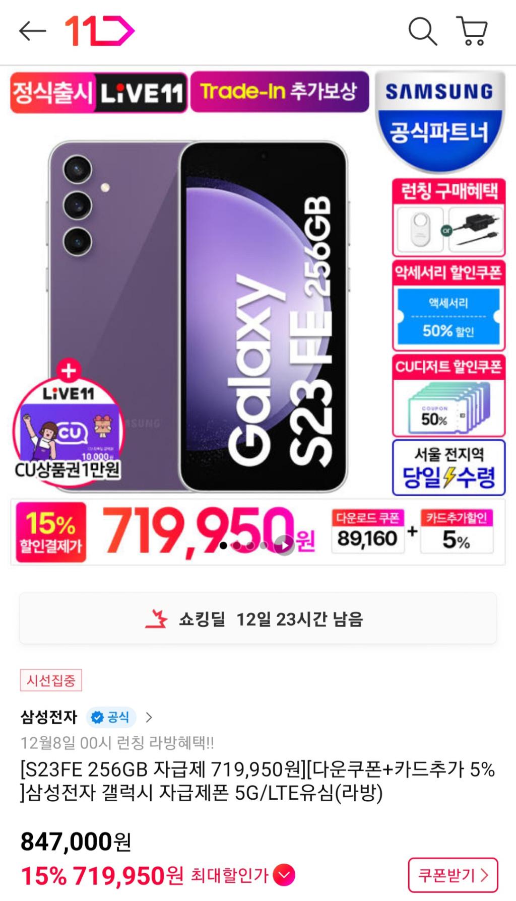 [11번가] 삼성전자 갤럭시 S23FE 자급제폰 256GB