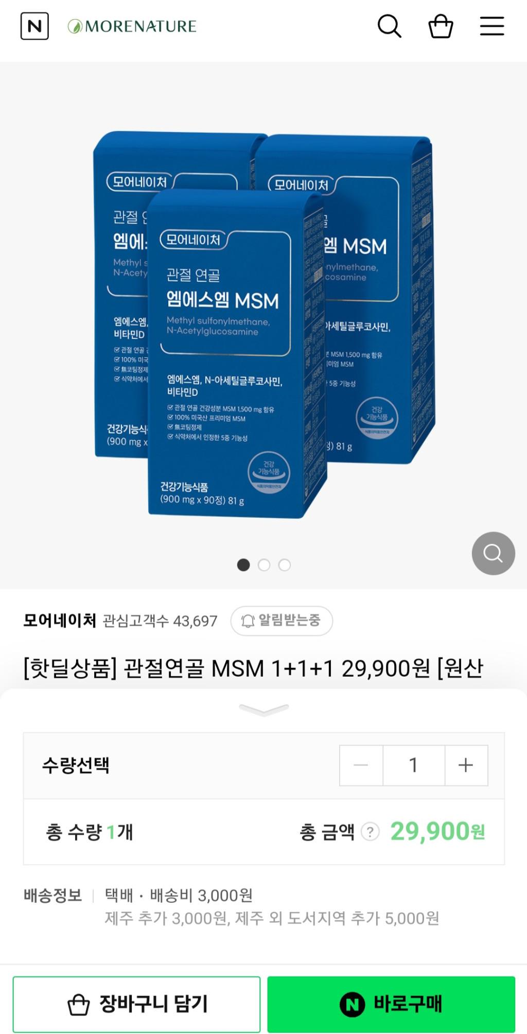 [네이버] 관절연골 MSM 1+1+1 29,900원/유배