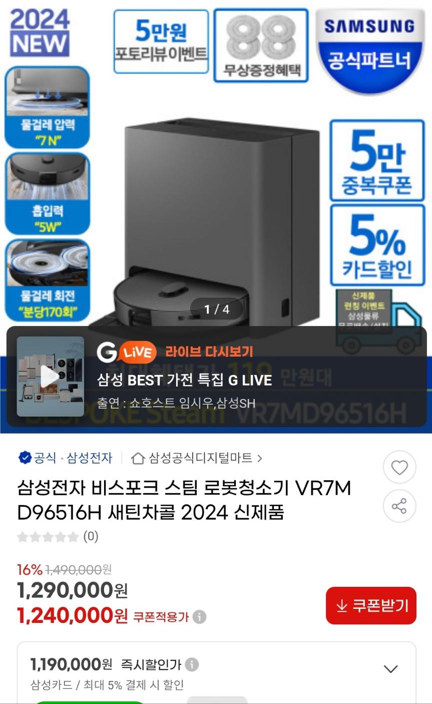 [G마켓] 삼성전자 비스포크 스팀 로봇청소기 VR7MD96516H