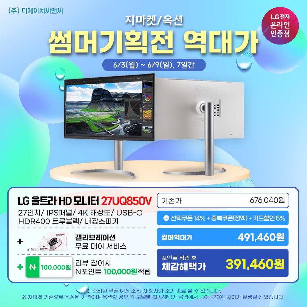 [G마켓] [옥션] LG 고명암비 UHD모니터 27UQ850V 썸머기획전 역대가 진행!