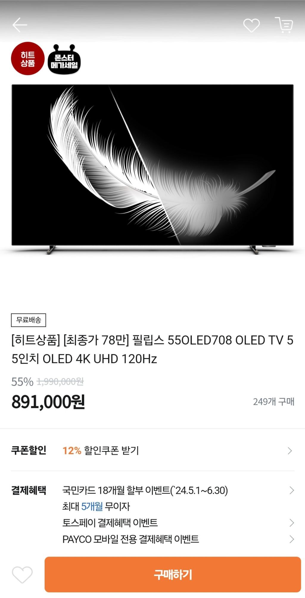 [티몬] [티몬] 필립스 55oled708 TV 토스페이시 78만원(무배)