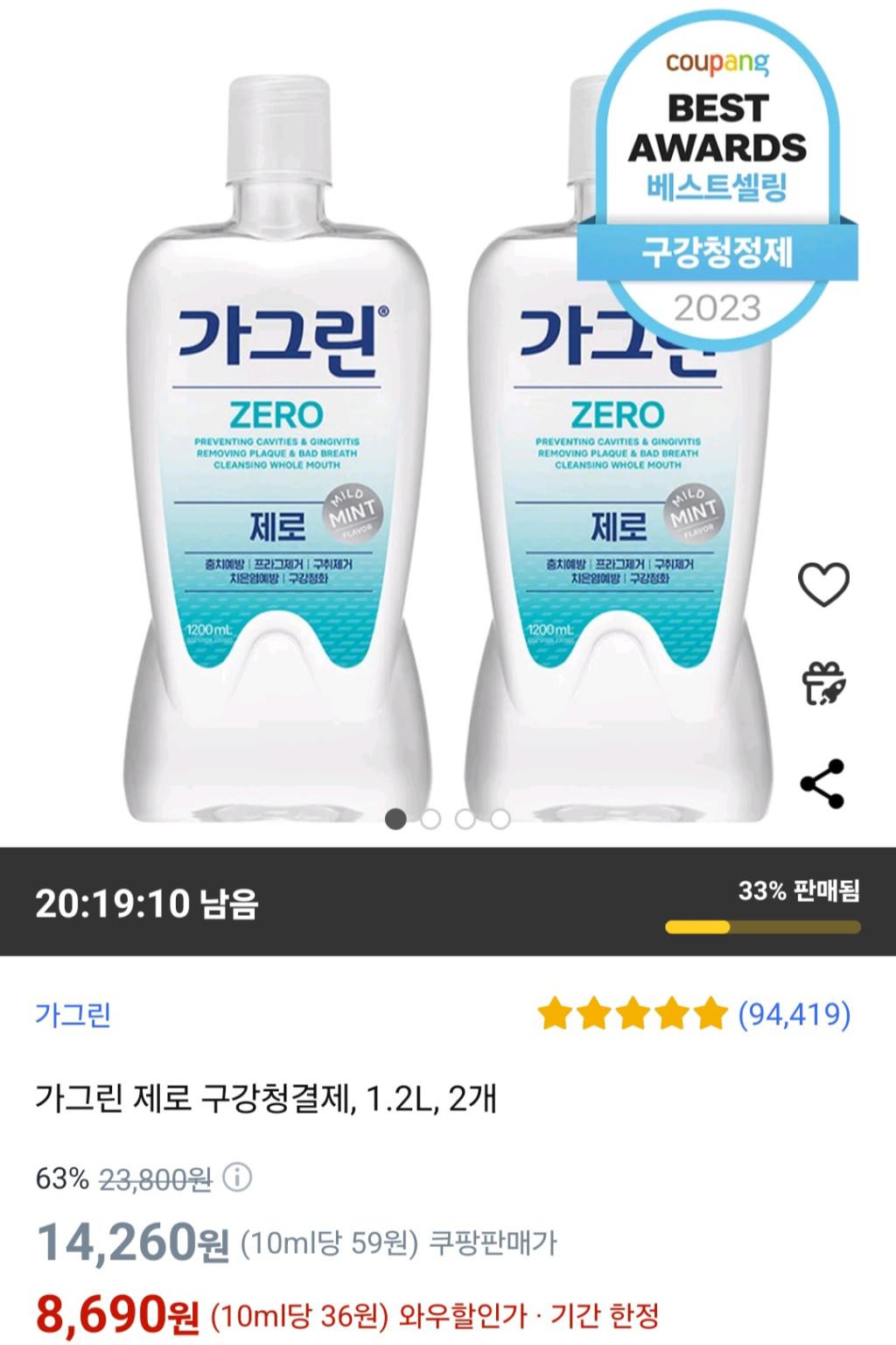 [쿠팡] 가그린제로 구강청결제 1.2L 2개