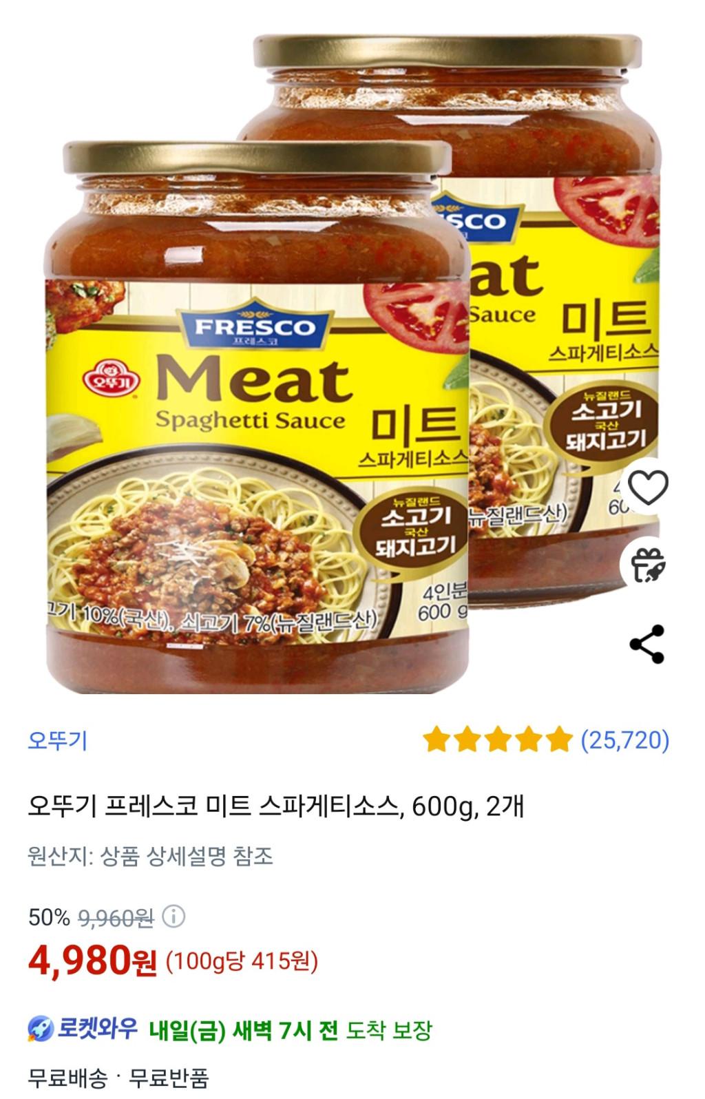 [쿠팡] 오뚜기 프레스코 미트 스파게티소스, 600g, 2개
