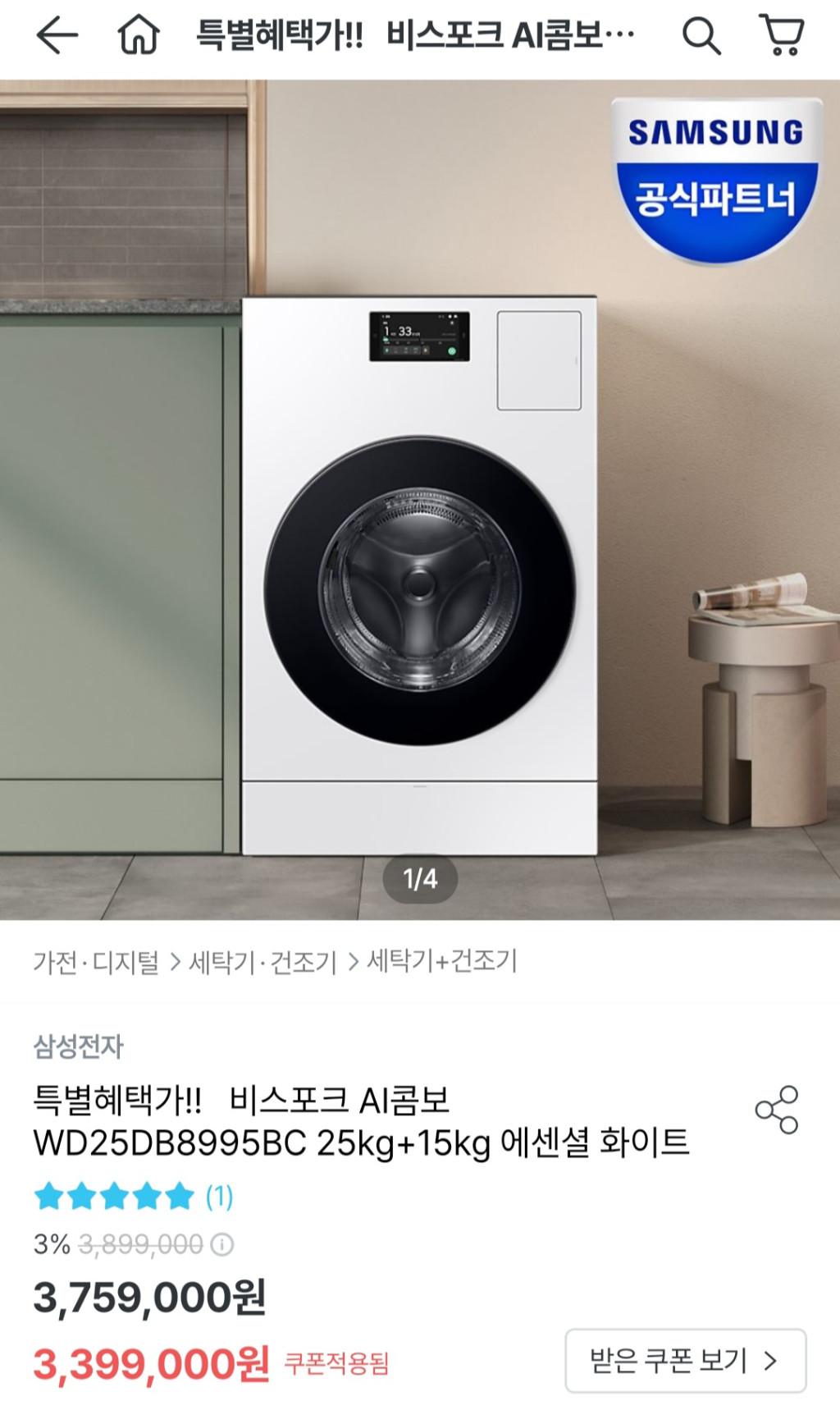 [오늘의집] 비스포크 AI콤보 WD25DB8995BC 25kg+15kg 에센셜 화이트